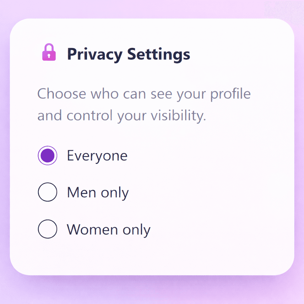 Control who sees your profile: only women, only men, or everyone—your safety, your choice.
